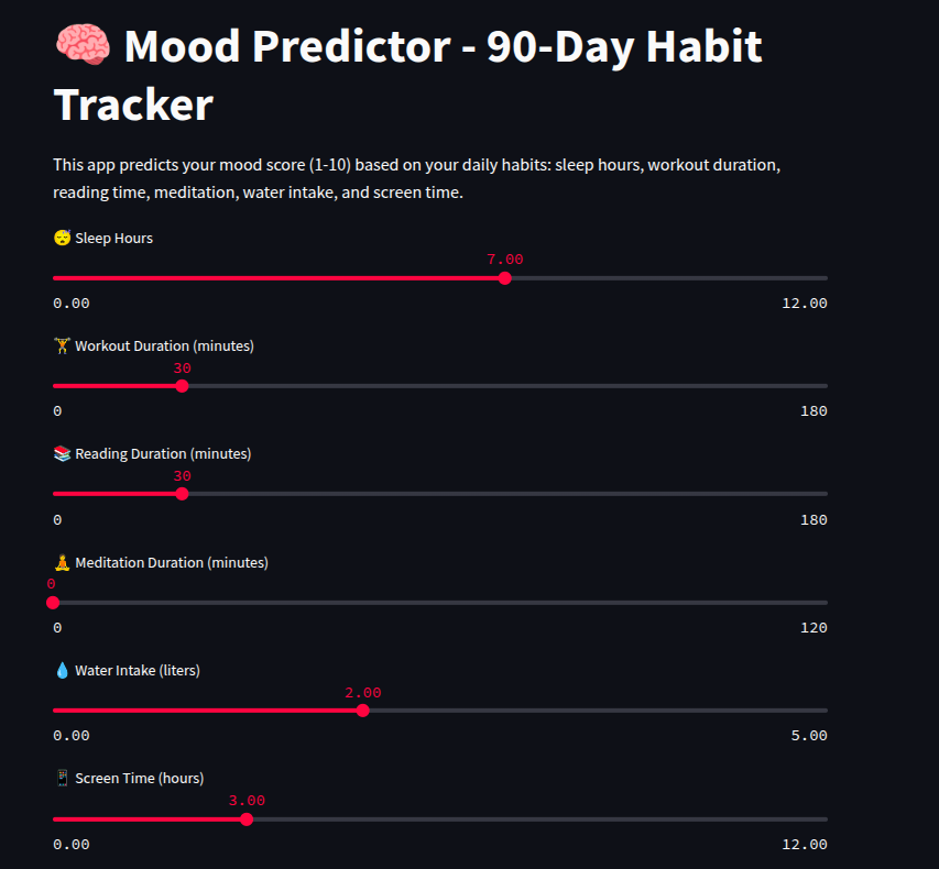 This is a Streamlit web application that predicts your daily mood score (1-10) based on your personal daily habits. It uses a pretrained machine learning model to estimate mood from habit metrics such as sleep, workout, reading, meditation, water intake, screen time, and more.
